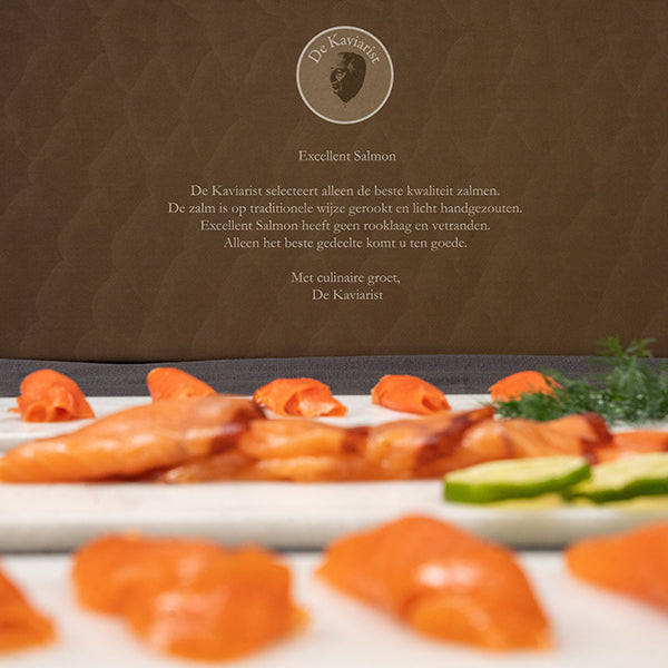Meer over onze zalmOnze "Excellent Salmon" wordt verantwoord bereid in een kleine rokerij. Ze worden met de hand gezouten en traditioneel op hout gerookt.