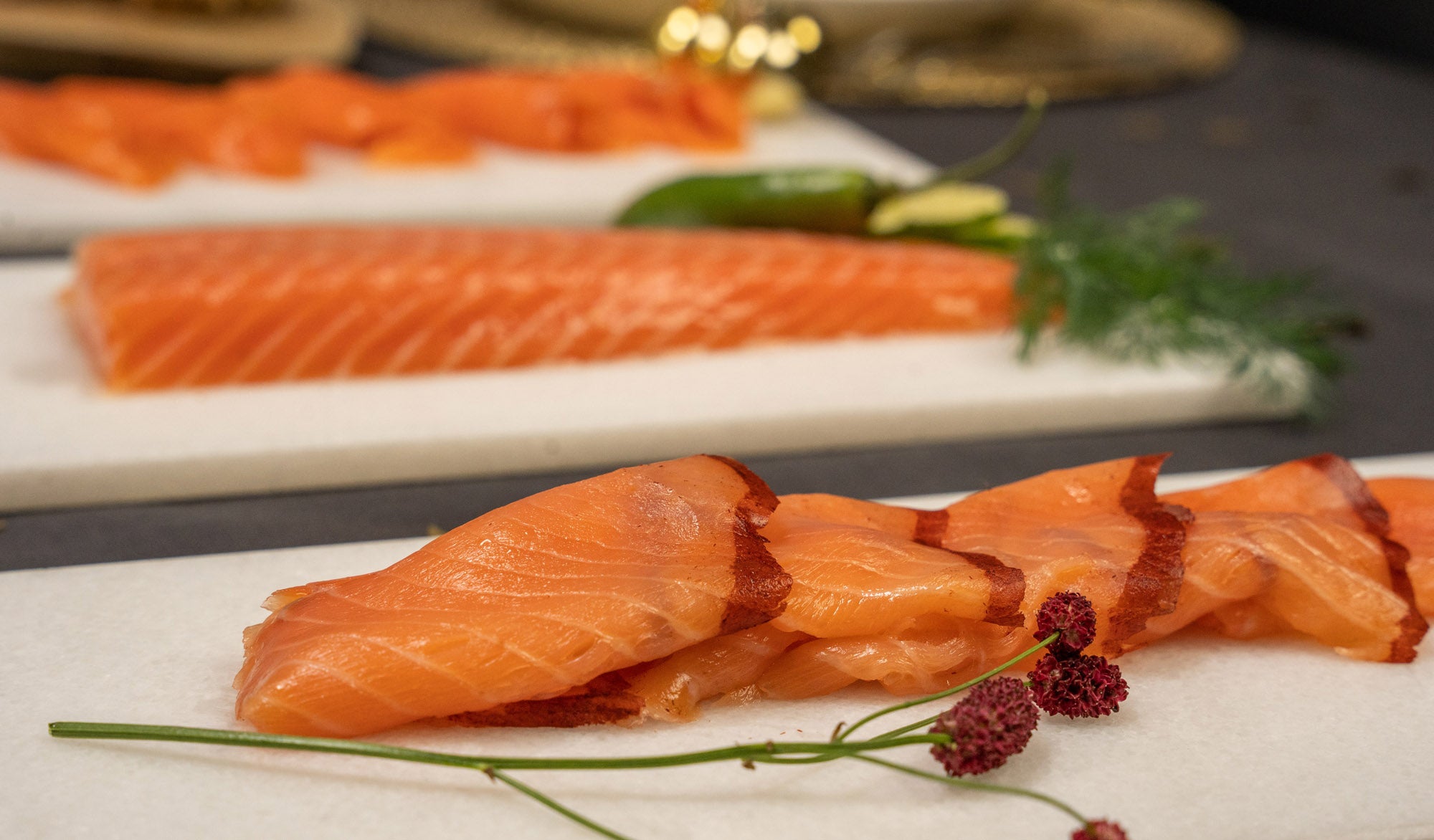 Meer over onze zalmOnze "Excellent Salmon" wordt verantwoord bereid in een kleine rokerij. Ze worden met de hand gezouten en traditioneel op hout gerookt.